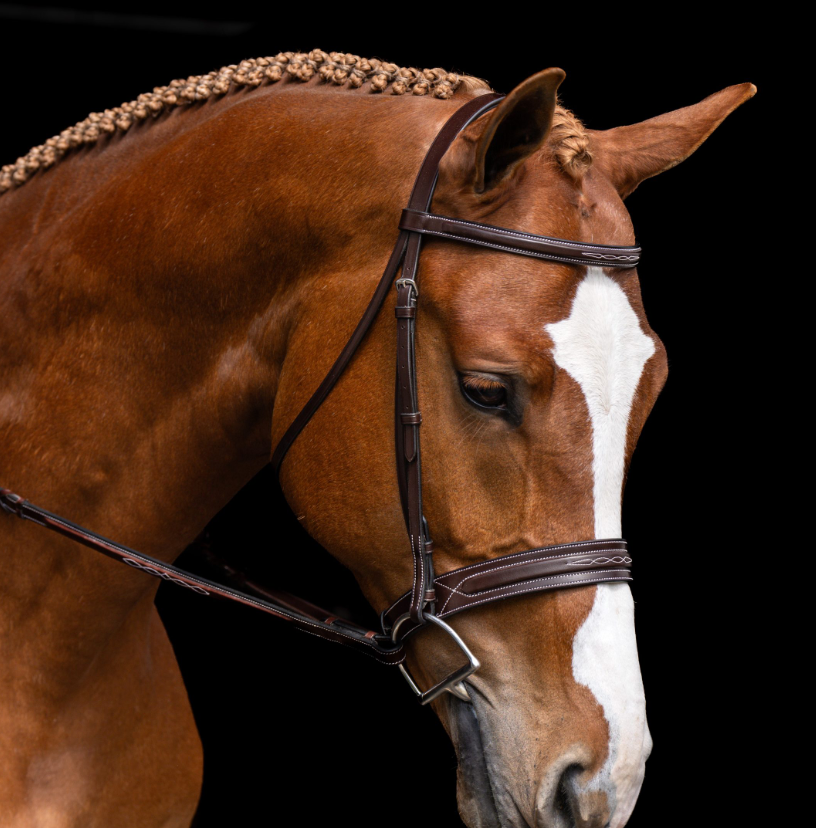 ntroducing the Hudson Bridle, a quintessential choice for the discerning rider who values both tradition and quality. Crafted with care in supple English leather, this bridle offers the ideal combination of quality and function, with modern show ring styling. The Hudson features a 1 1/4″ fancy stitched noseband with low profile square raising, a matching 3/4″ browband, and 1/2″ cheek pieces. This bridle has no padding. Comes complete with 5/8″ fancy stitched square raised laced reins. All hardware is stainless steel, with hook stud ends and a roller-buckle on the noseband.