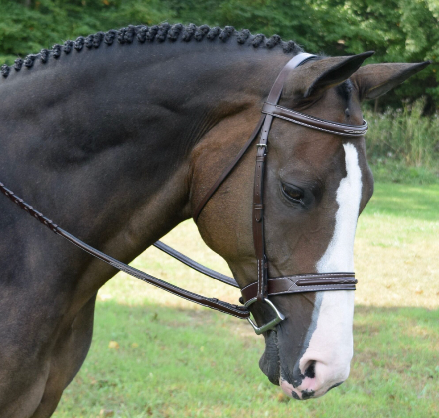 The Sonoma is unique to our Red Barn Hunter Bridle collection, differentiated by its narrow round raising and detailed stitching accents. On trend with the “A” circuit show ring, the best-selling Sonoma Bridle offers a timeless look with a 1 1/4” round raised fancy stitched noseband, a matching 3/4″ browband, and ½” cheek pieces. The Sonoma design is low profile and has no padding. Comes complete with 5/8” fancy stitched round raised Laced Reins. All hardware is stainless steel, with hook stud ends and a roller-buckle on the noseband. This bridle is made of high quality vegetable-tanned English leather.