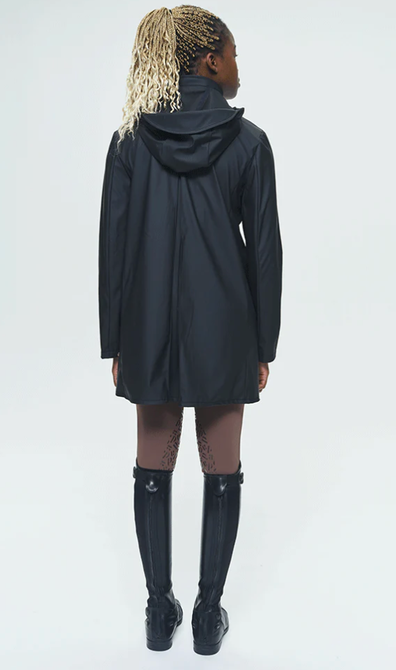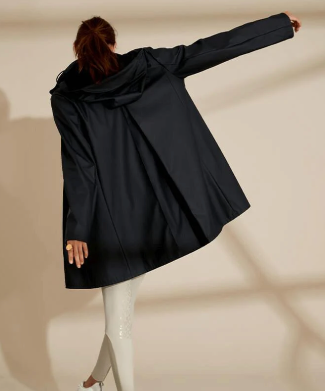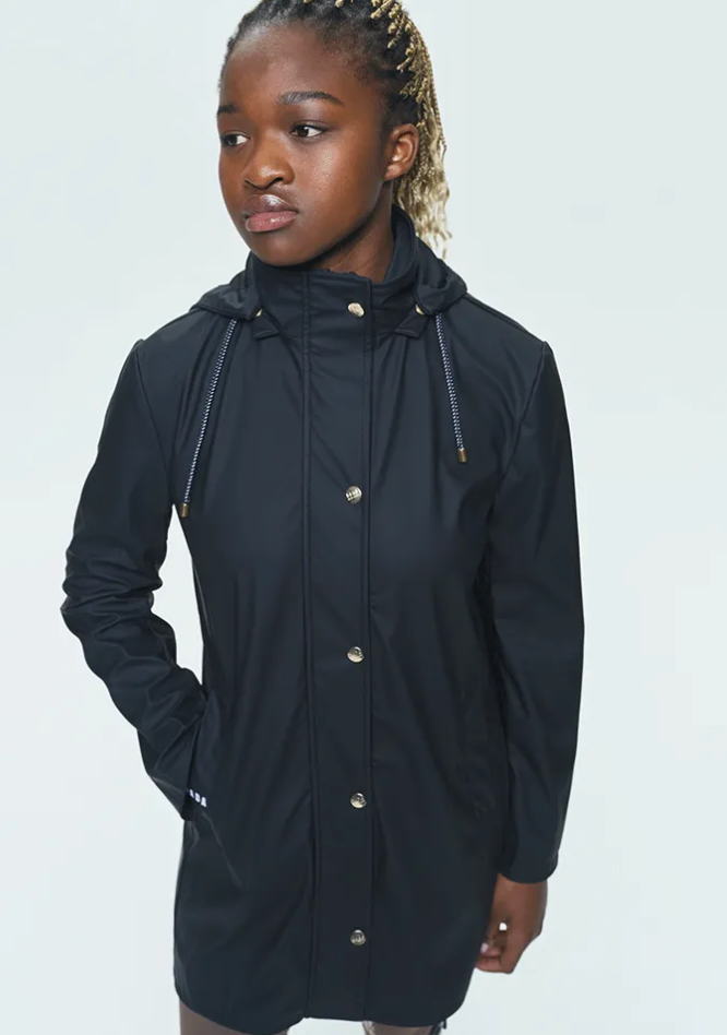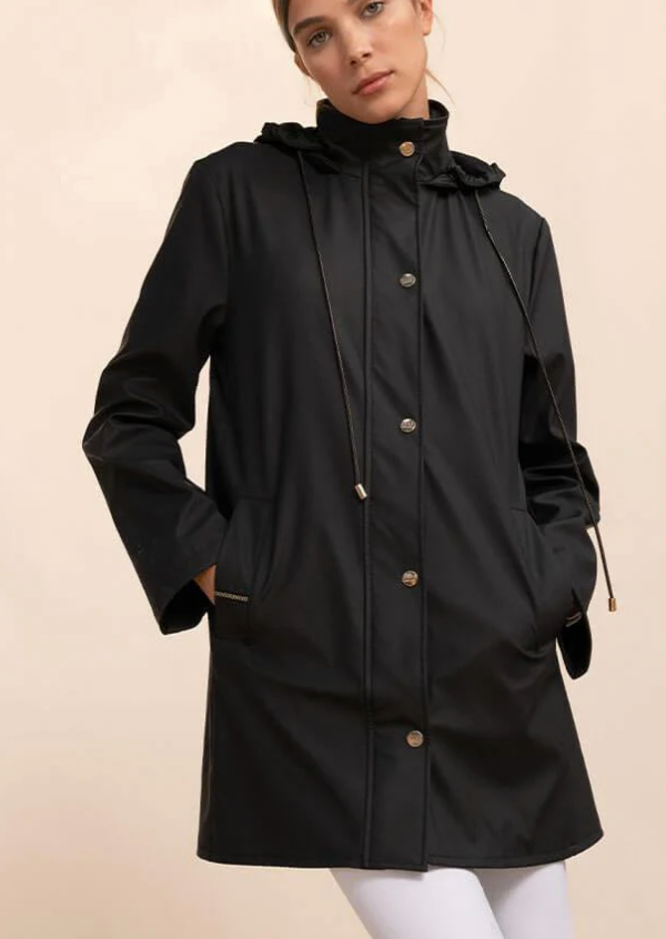 Raincoat combining elegance and practicality. Fitted cut, removable hood and waterproof fabric: perfect for facing rainy days.