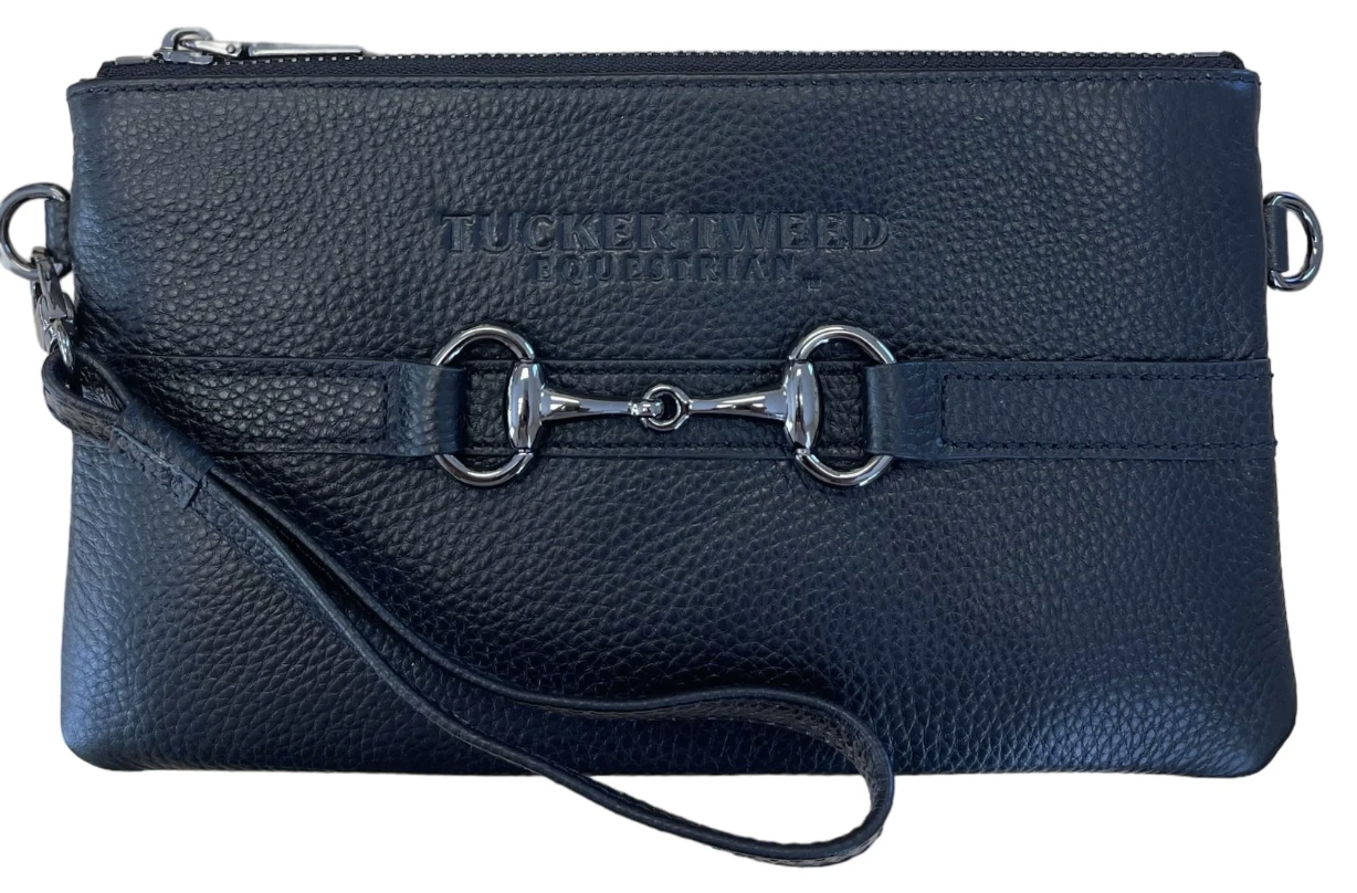 Equestrian meets convenience, in classic Tucker Tweed style. The Wellington Wristlet pays tribute to the 12 weeks annual Winter Equestrian Festival, a destination for the world’s finest horses and riders. Complete in fine pebble-grain leather, this rider-requested style is available in 4 solid colors with contrast color accents and snaffle bit detail. The wristlet interior is lined completely in signature red with leather accents, featuring 6 card pockets, bill pocket, private zipper pocket, and room for the largest of cell phones. A removable wristlet strap can attach on the side, on the zipper, or remove for clutch carry. Versatile, simple, equestrian luxury.