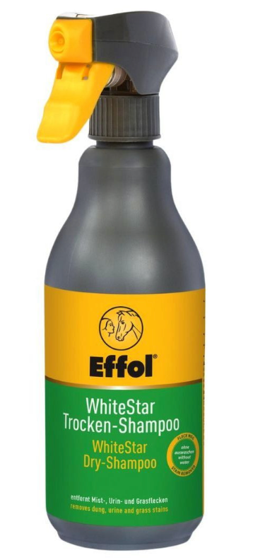Effol WhiteStar Dry Shampoo Spray is especially valuable for those with greys and other light colored horses and horses with white markings. WhiteStar easily removes urine, manure, and grass stains without whiteners or peroxide. For spot cleaning and all-over cleaning, spray WhiteStar onto the damp coat area, rub in, and remove with a towel or sponge. If water is unavailable or impractical, spray the product onto a dry coat. Effol WhiteStar Dry Shampoo Spray is a liquid that is pH-neutral and maintains the natural feel of the coat without getting it slippery.